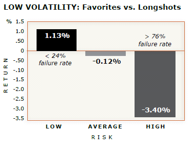 Contrary to the zeitgeist, the anomaly attests that higher risk doesn’t necessarily imply higher return. In fact, research, both at Analytic and elsewhere, has suggested that portfolios comprised of the lowest risk equities outperform their risky counterparts. This phenomenon is not only apparent in domestic and global equities, but in the majority of the world’s asset classes. Research has extended this paradigm to horse racing and gambling in general. After taking a look at NFL betting markets, we’ve found evidence of low volatility outperformance at the franchise level and with respect to heavy underdogs (longshots). ..