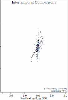 First, there's the paper that made this May's American Economics Review, Subjective Well‐Being and Income: Is There Any Evidence of Satiation? Here they document two things. First, that cross-sectionally, higher GDP/capita generates higher happiness. Strangely, they find that the income-happiness effect is at least twice as strong among richer countries, which no one thinks is true (the effect should decrease as wealth increases), and further using one set of data the effect of income on happiness is negative. The authors note, however, that this is merely because of one country, the Phillipines. Strange that 2 of the 5 observations here were significant in the direction no one argues is true. If this was the effect of one single country, could such an explanation be responsible for the positive effect for the rich countries? The data look disputable (one chart shows Denmark and Norway above Italy and Spain, which would be unusual). That said, by itself it does support their assertion.